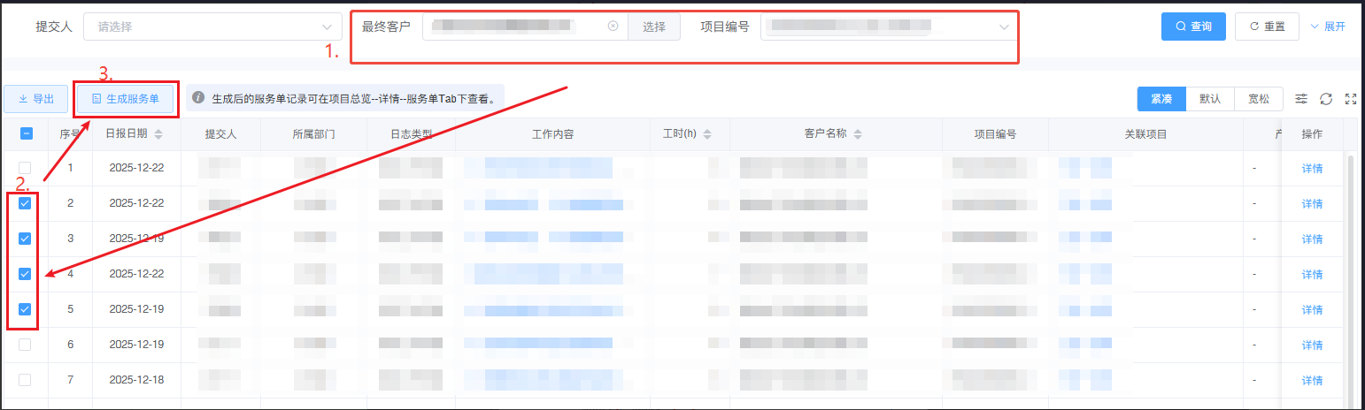 (1)在【交付日志明细】页面筛选中选择最终客户和项目编号;