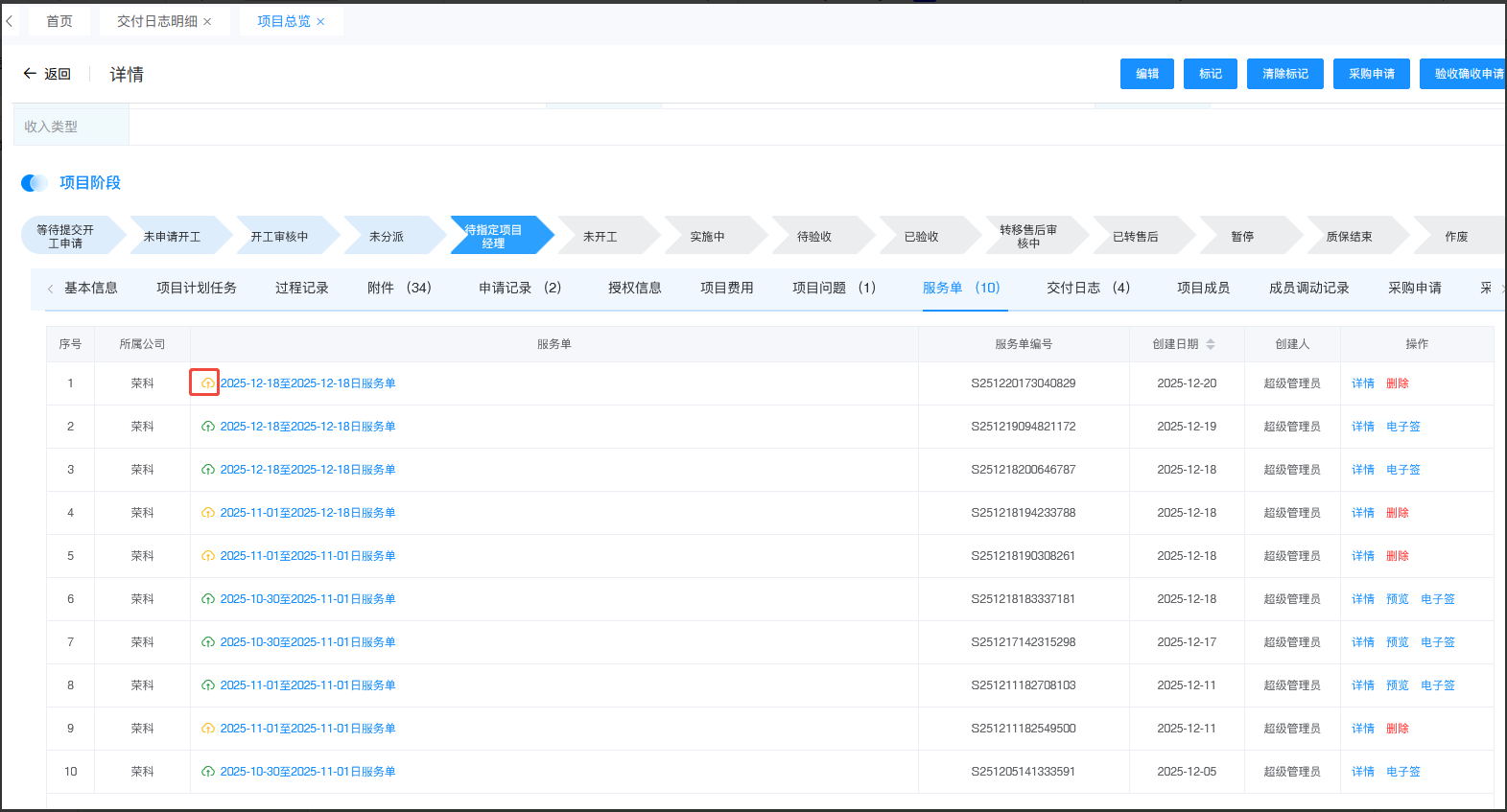(1)PC端,【项目总览】-项目详情-服务单列表中,点击服务单标题或者“详情”按钮,可以预览/打印/下载服务单;