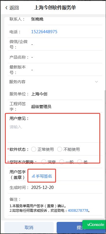 (2)输入相关信息,并进行”手写签名“后,点击”提交“即可完成服务单电子签名;